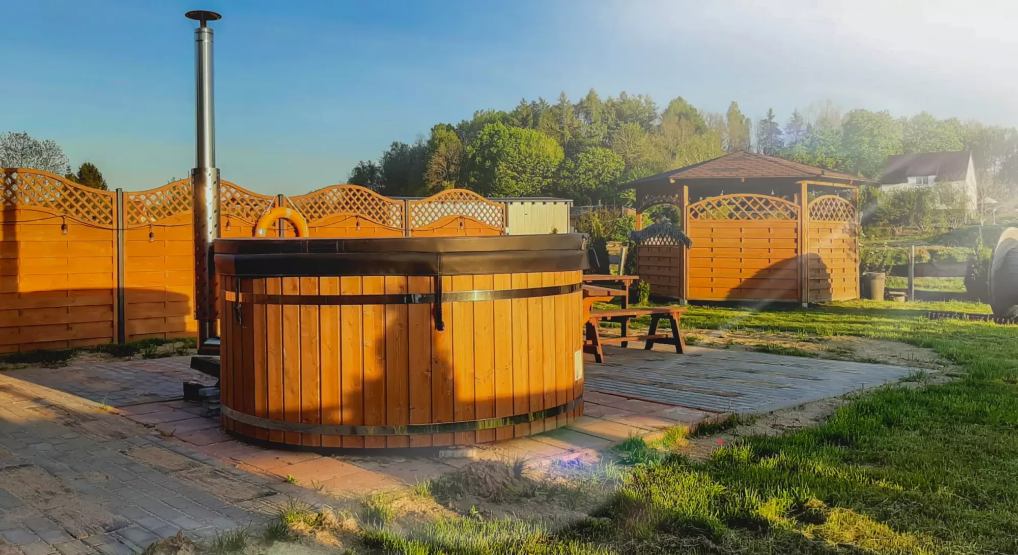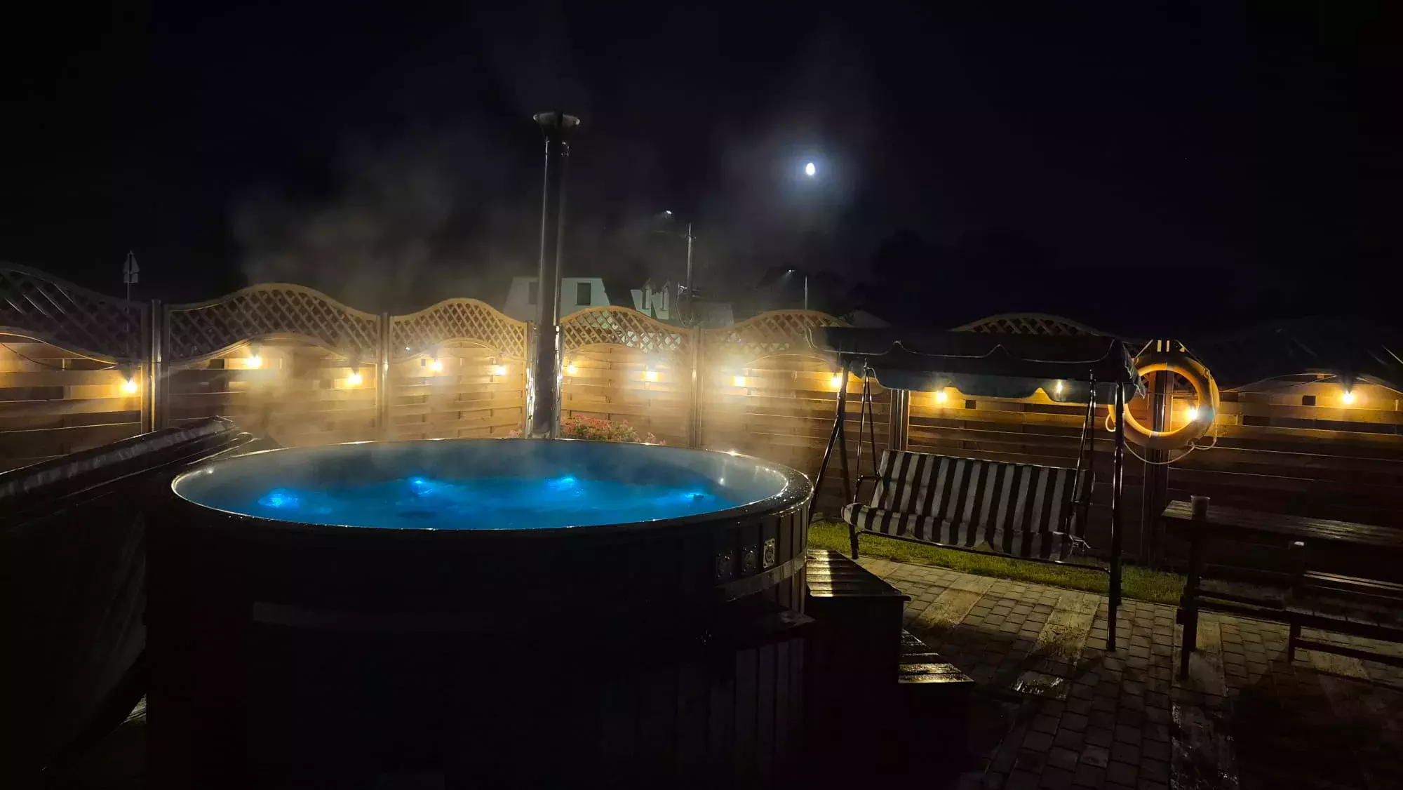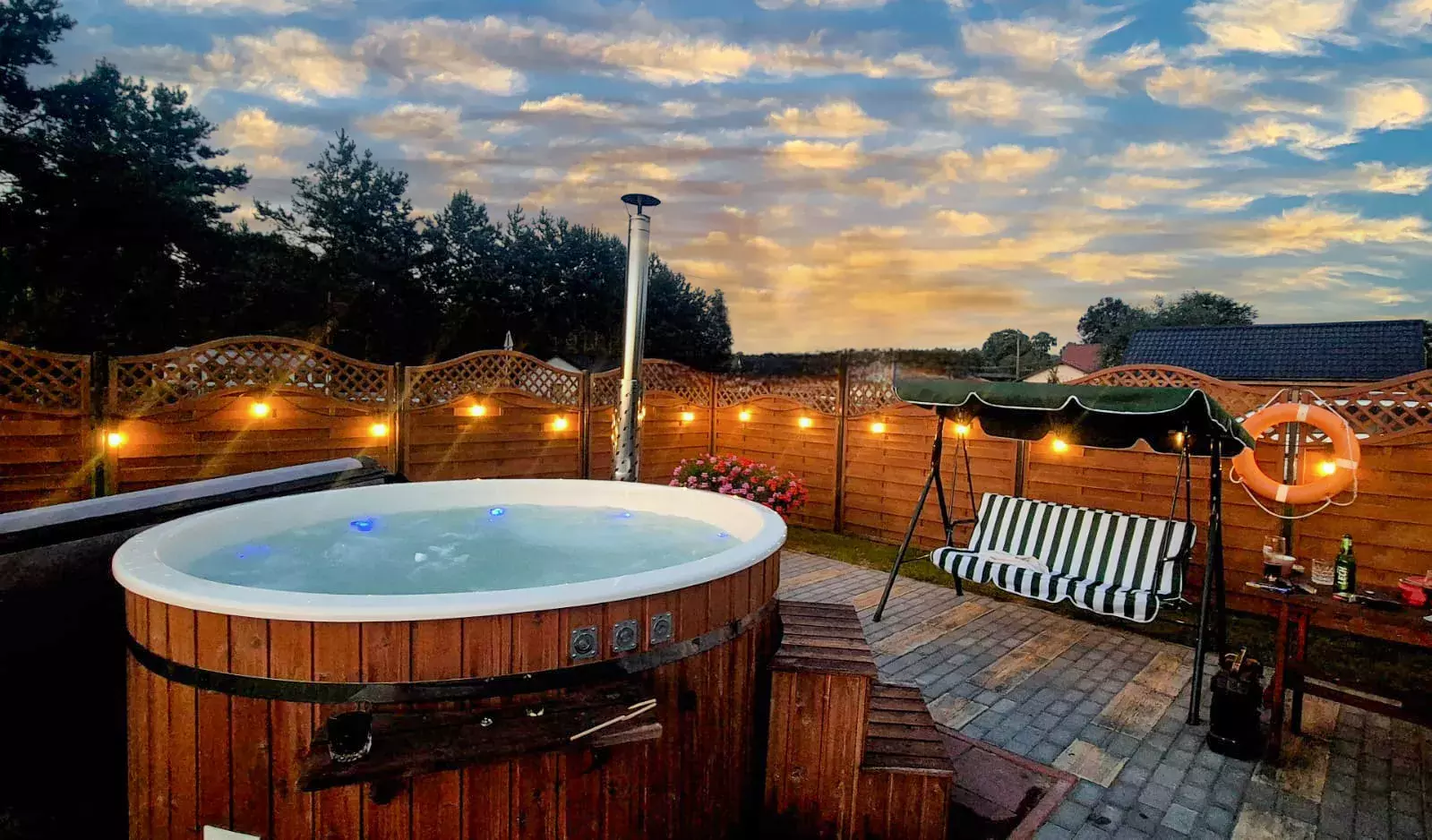 Jedną z największych atrakcji naszego obiektu jest gorąca balia ogrodowa z jacuzzi i hydromasażem. To idealne miejsce na relaks po całym dniu — niezależnie od pogody. Ciepła woda, masaż bąbelkami i spokojne otoczenie pozwalają w pełni odpocząć, a kąpiel pod gołym niebem tworzy wyjątkowy klimat, szczególnie wieczorem. To świetna propozycja zarówno dla par, jak i grup przyjaciół, które chcą spędzić czas w komfortowy sposób i dodać pobytowi odrobinę luksusu.